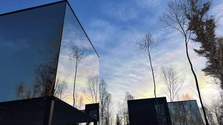 The mirrored exteriors reflect the changing light and surrounding nature, making each cabin feel quietly hidden – yet deeply connected to the landscape.